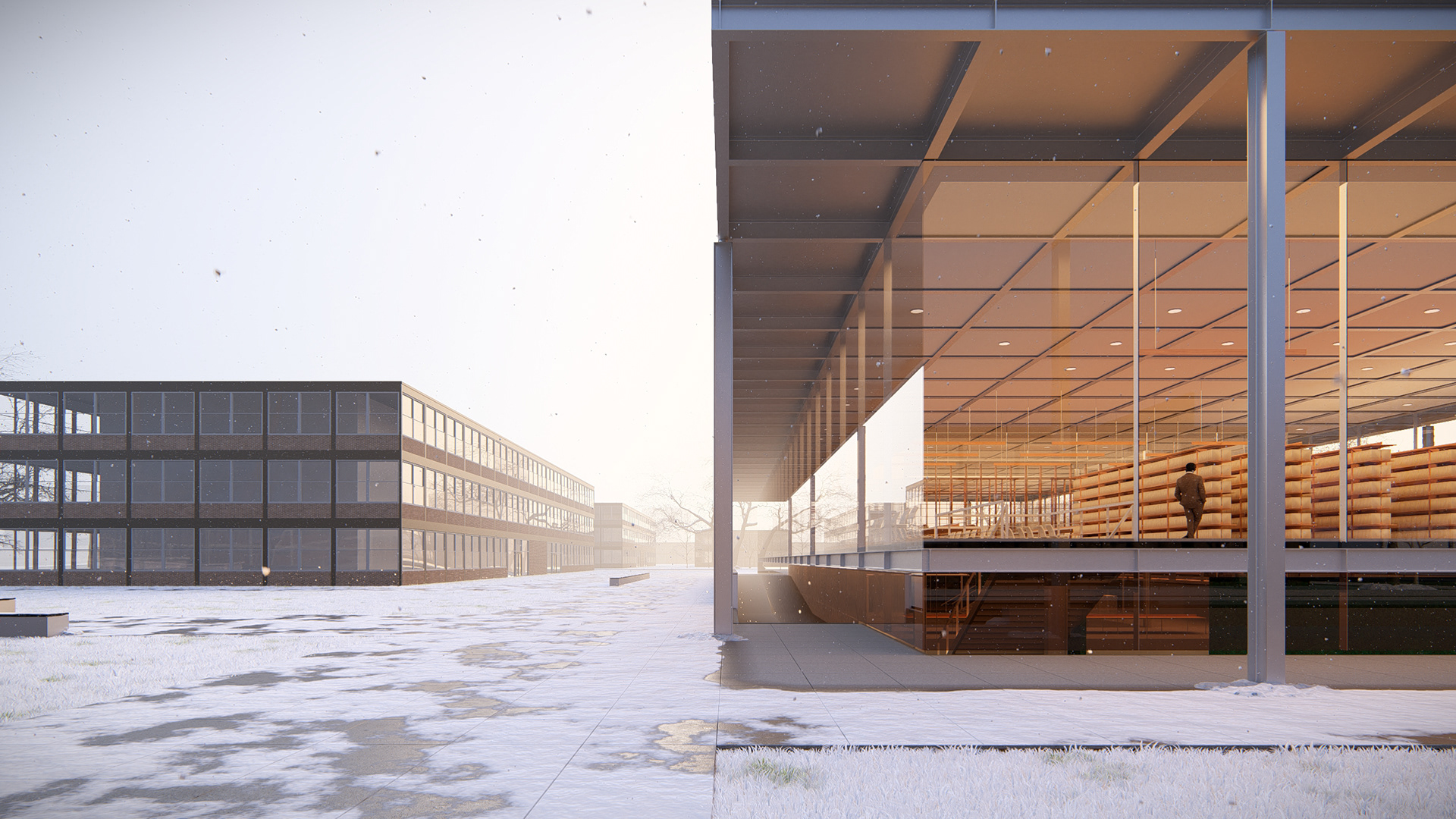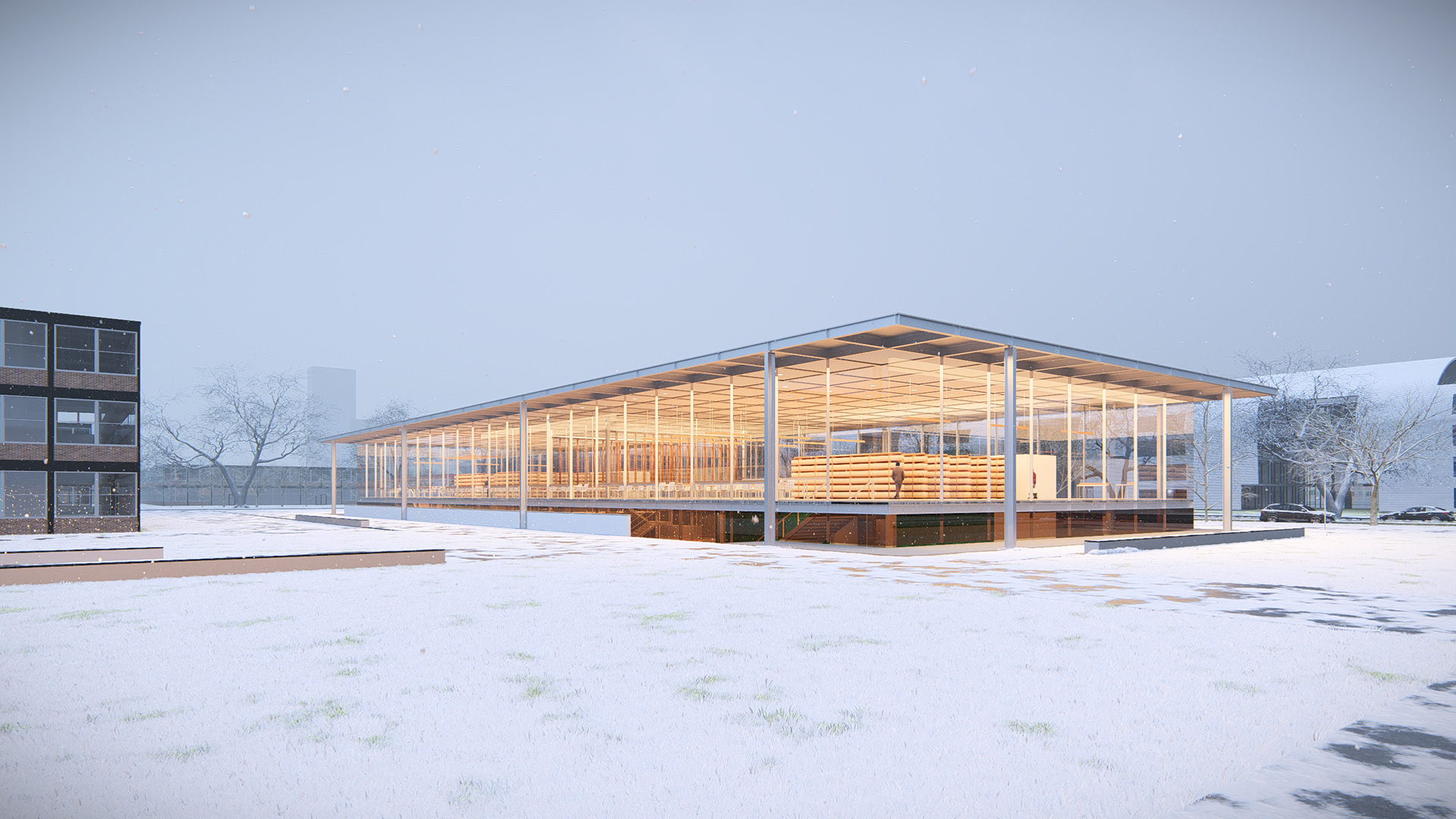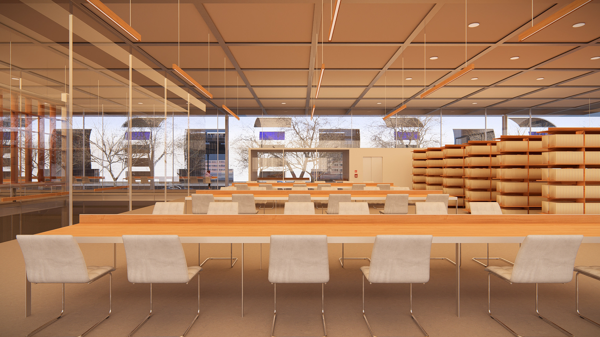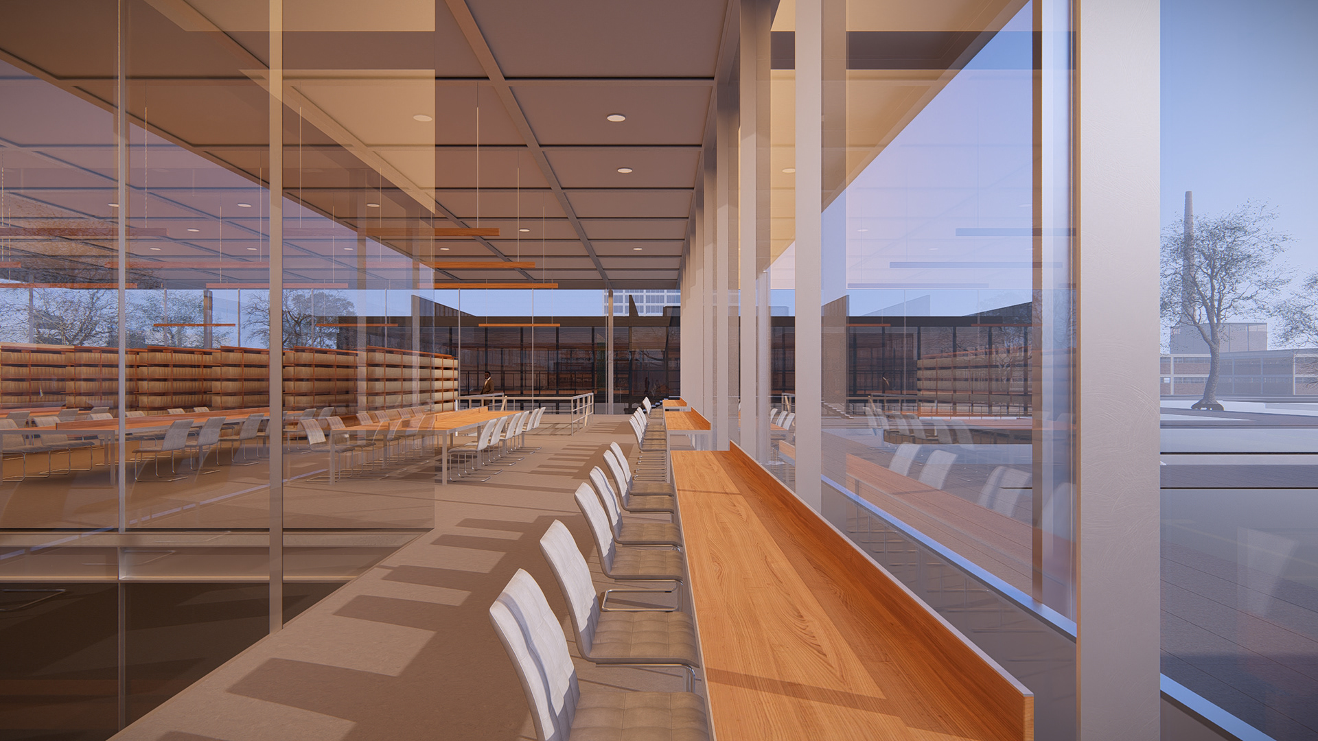 A nova biblioteca adota a grelha estrutural como linguagem — ecoando as proporções do Crown Hall — e acomoda seu programa em dois pavimentos e um subsolo. Essa contenção volumétrica preserva a escala do conjunto e reforça o compromisso com a harmonia.