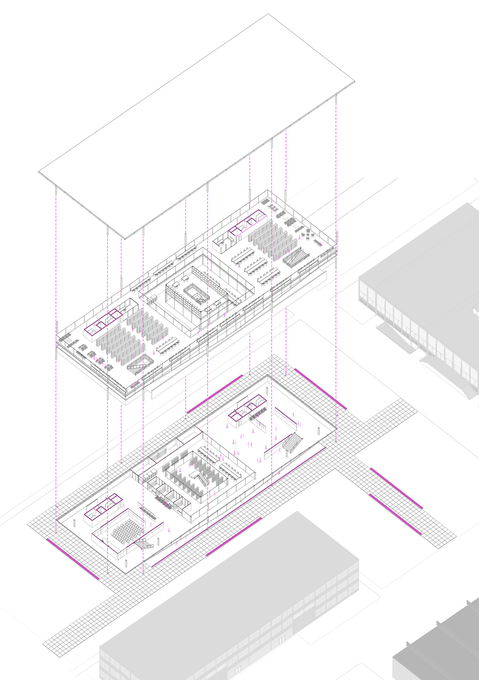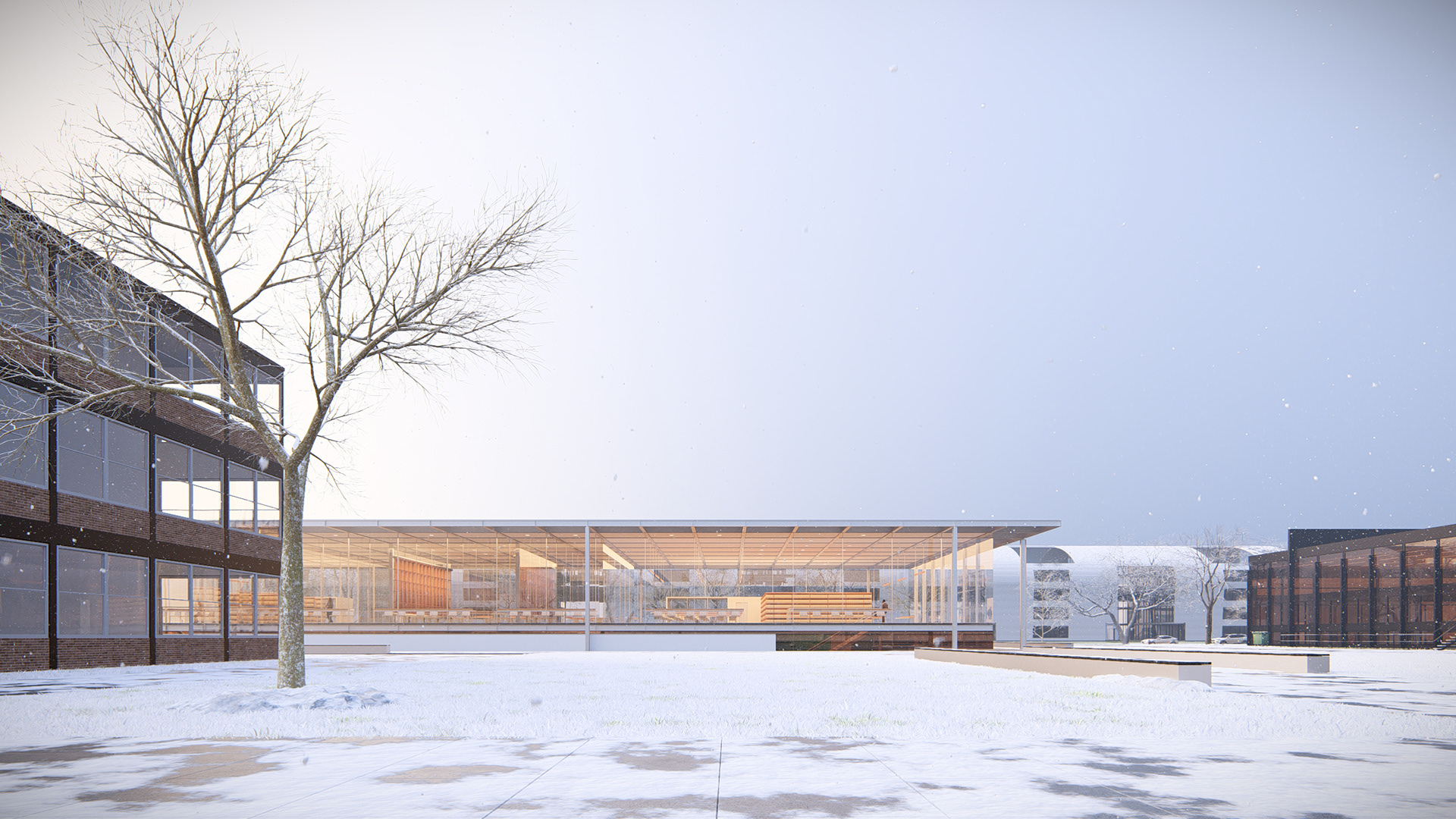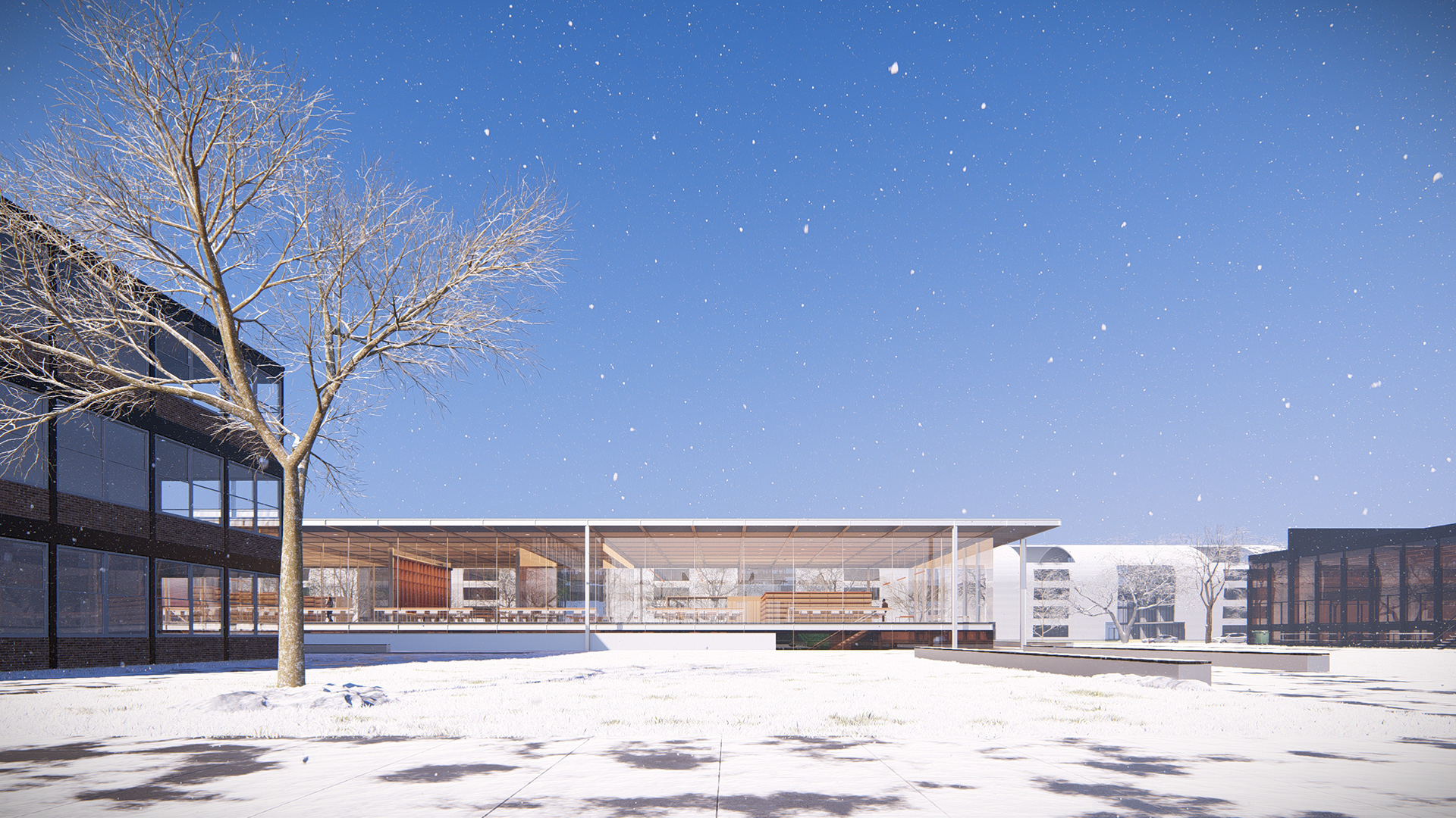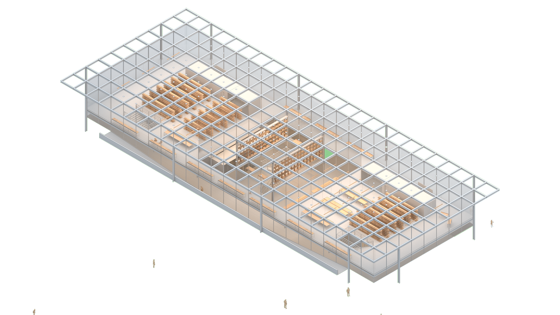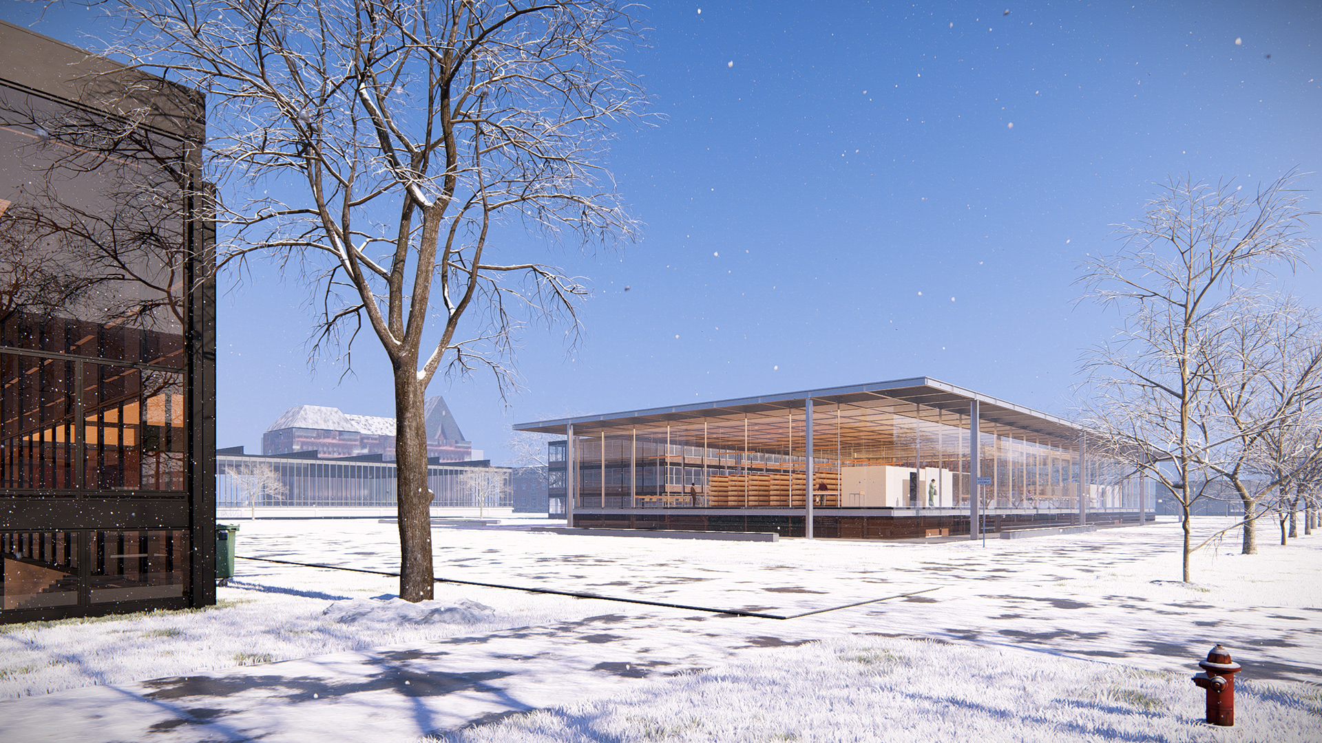 A nova biblioteca adota a grelha estrutural como linguagem — ecoando as proporções do Crown Hall — e acomoda seu programa em dois pavimentos e um subsolo. Essa contenção volumétrica preserva a escala do conjunto e reforça o compromisso com a harmonia.