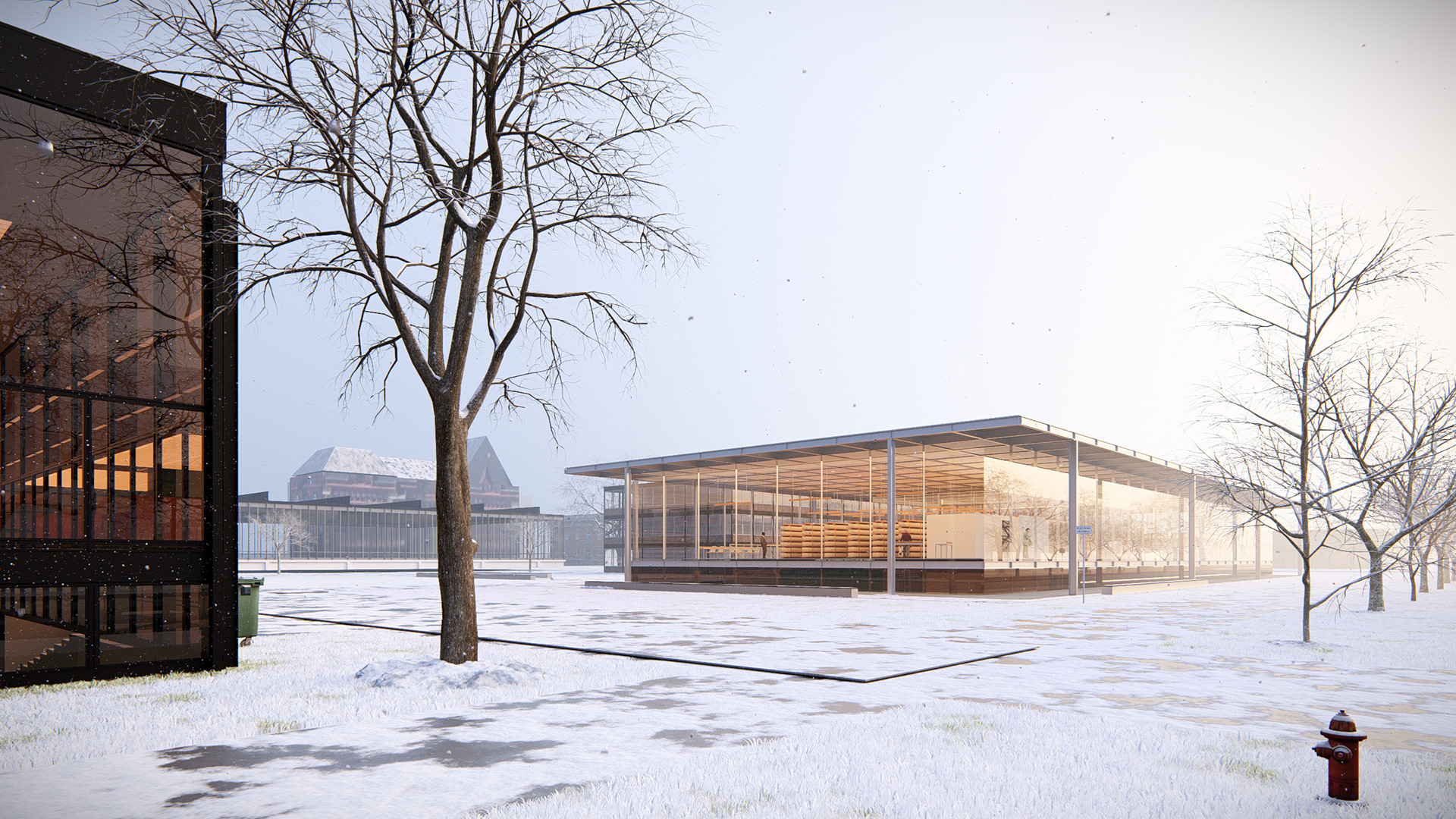 Implantado com precisão entre edifícios projetados por discípulos de Mies van der Rohe, o Mies Memorial propõe mais do que um tributo: estabelece um diálogo silencioso e respeitoso com seu entorno.