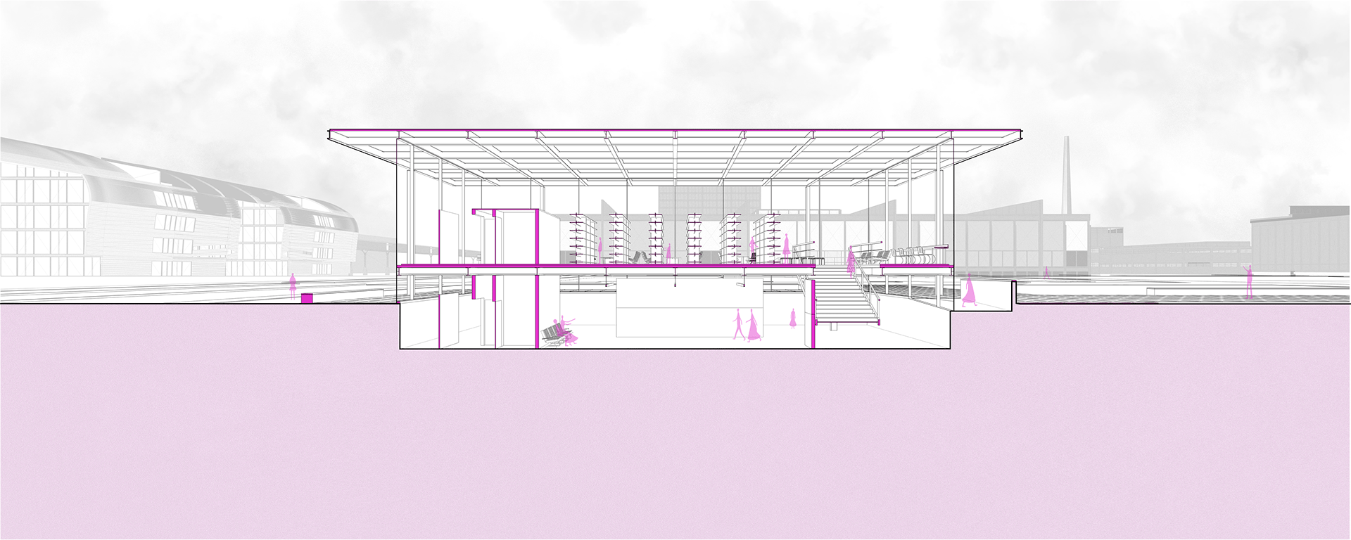 O pavilhão principal, uma caixa de vidro opaca, abriga os saberes. A rampa-promenade atravessa o átrio e conecta os espaços de criação e aprendizagem. O auditório se volta à paisagem e, em sua parte posterior, abre-se como ágora — espaço de escuta, troca e pensamento coletivo.