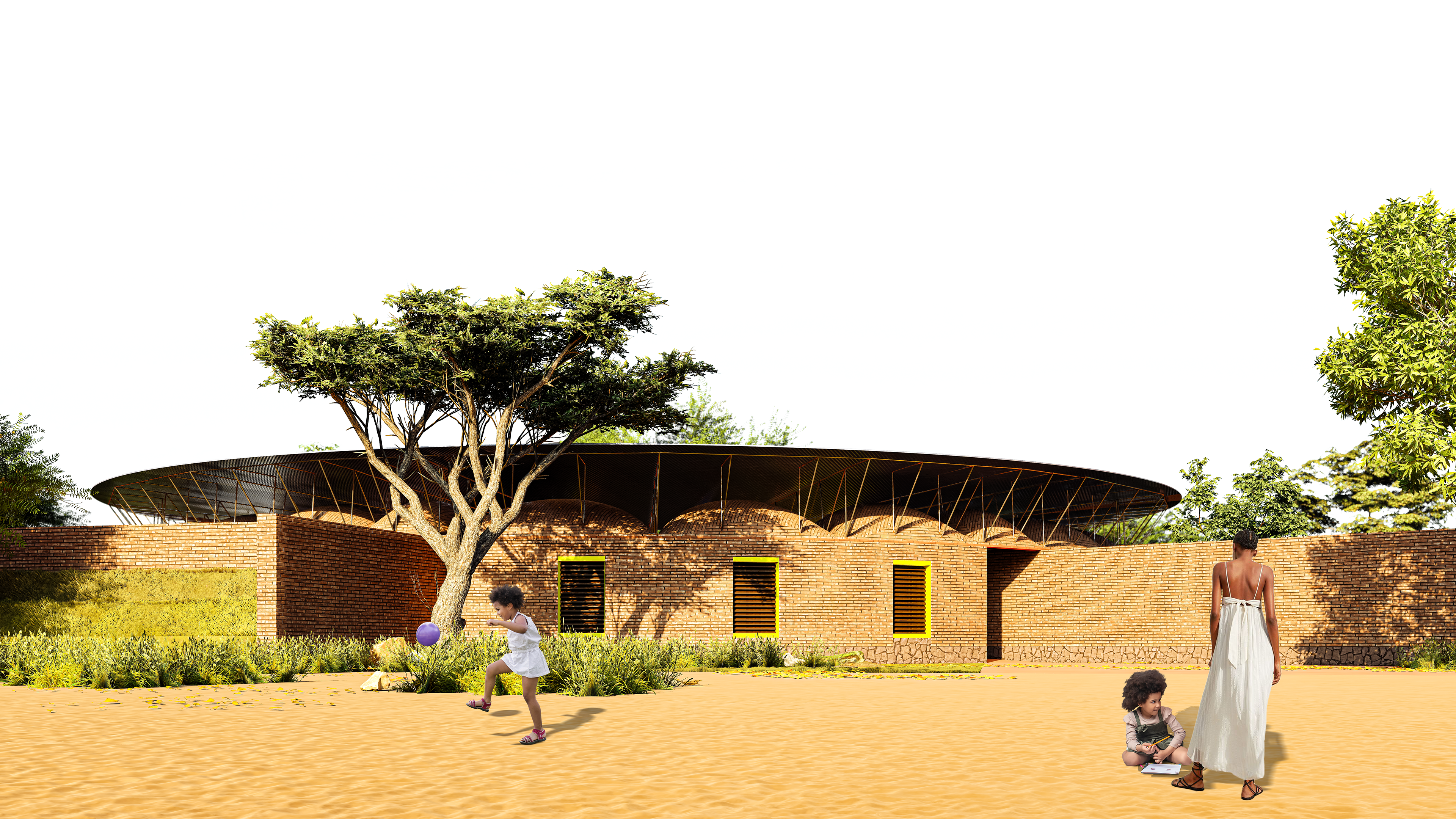 O projeto enfrenta as condições extremas com engenhosidade: temperaturas que variam entre 29ºC e 43ºC, ventos quentes e secos carregados de areia e recursos financeiros quase nulos. A resposta está no uso criativo de materiais vernaculares — areia, argila e pedra laterítica — e em soluções de climatização passiva.